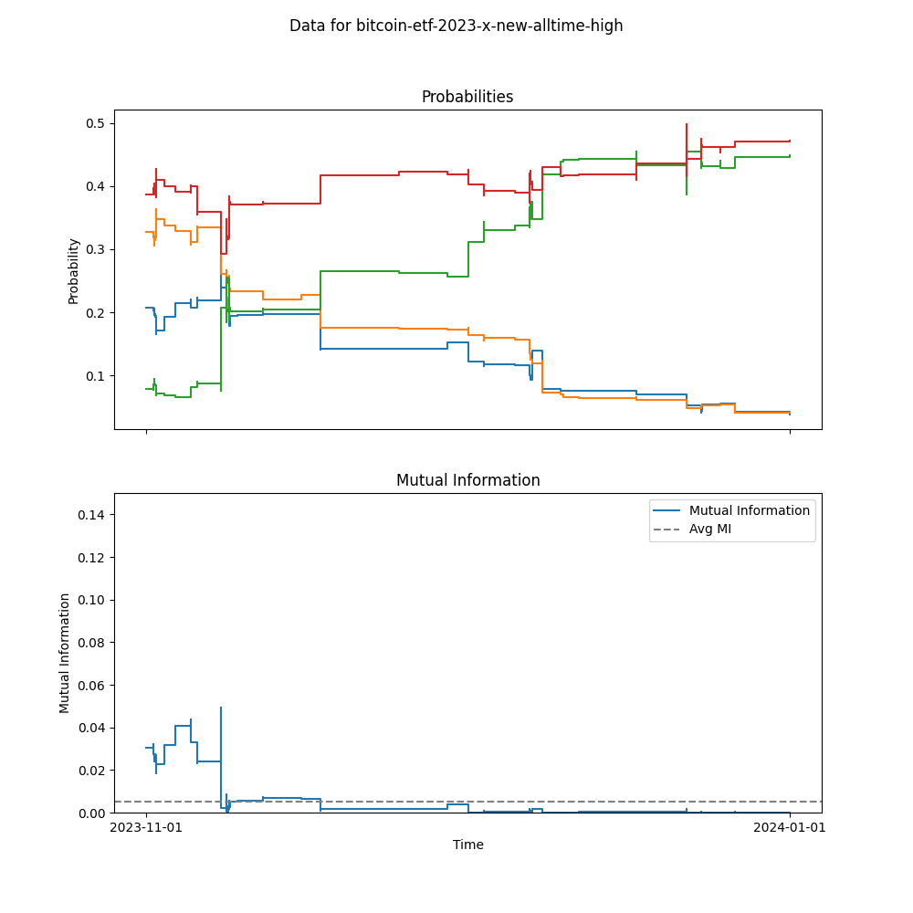 Here are the charts that my code produced to visualize the evolution of the probabilities over time and the key figure of merit of the competition: The mutual information of the joint market.